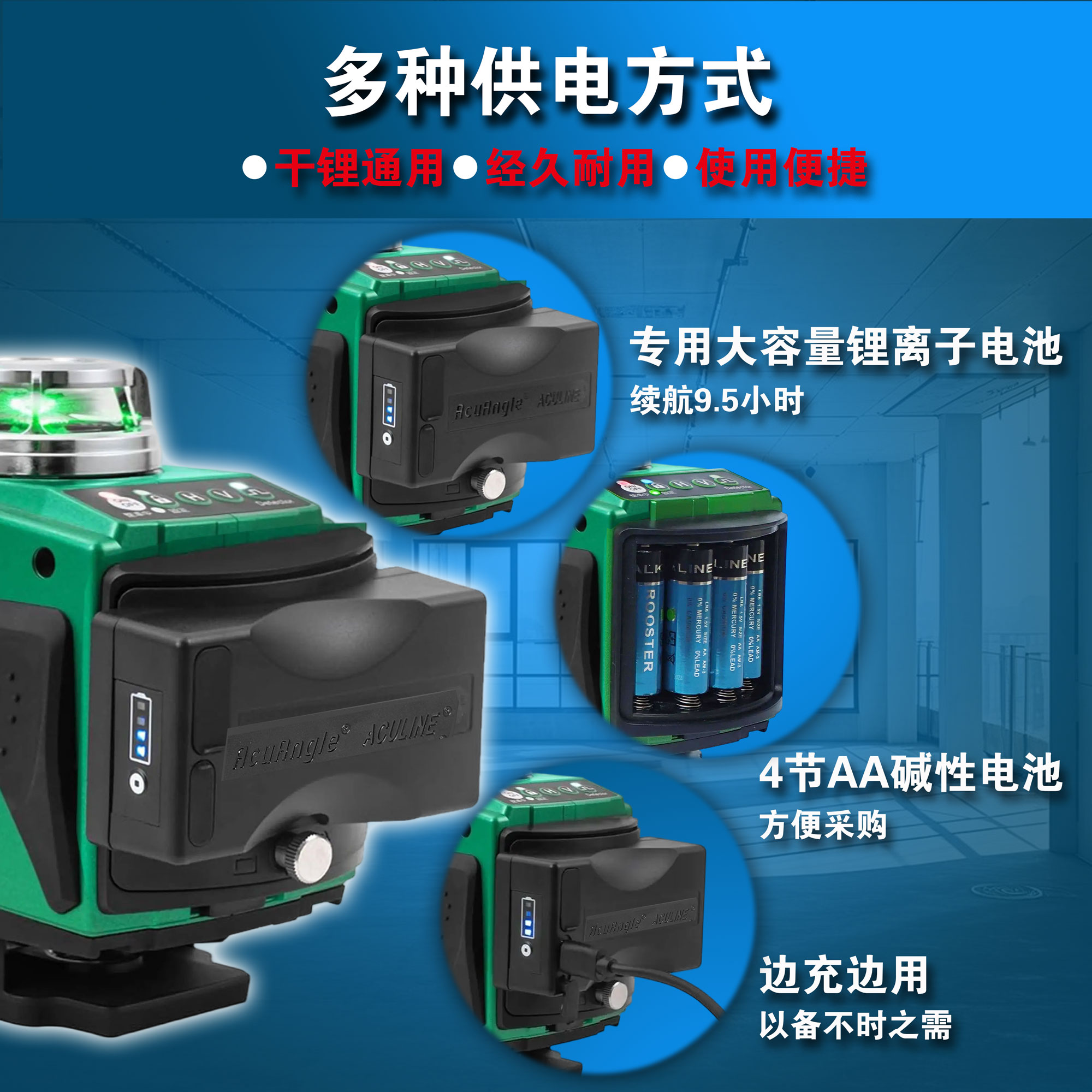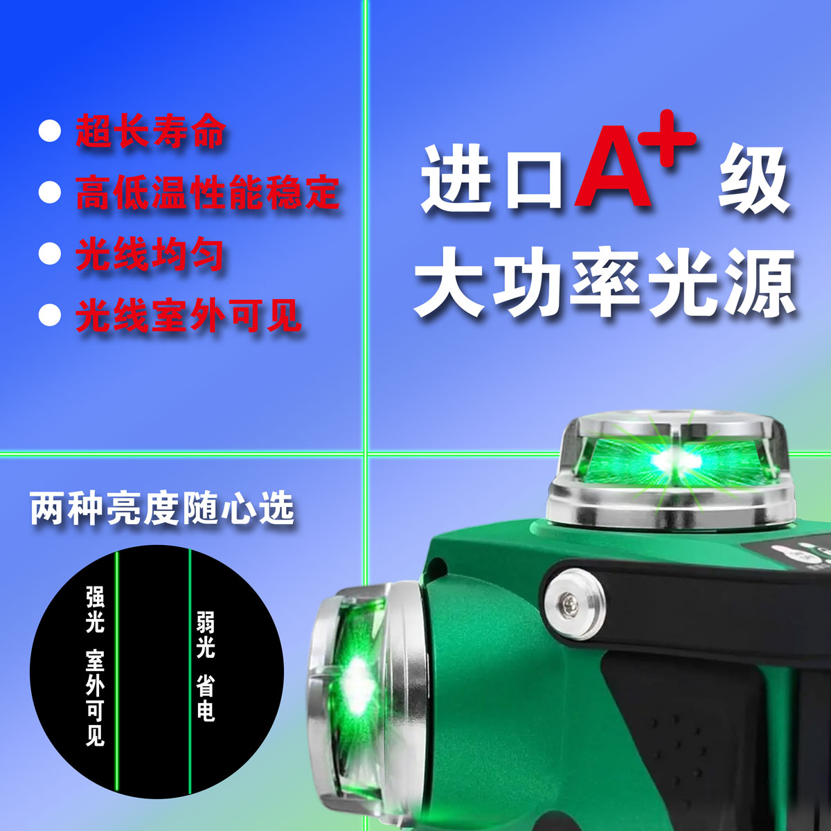->投射4条360°全方位绿激光线,贴墙、贴地一机实现,满足多种施工需求。