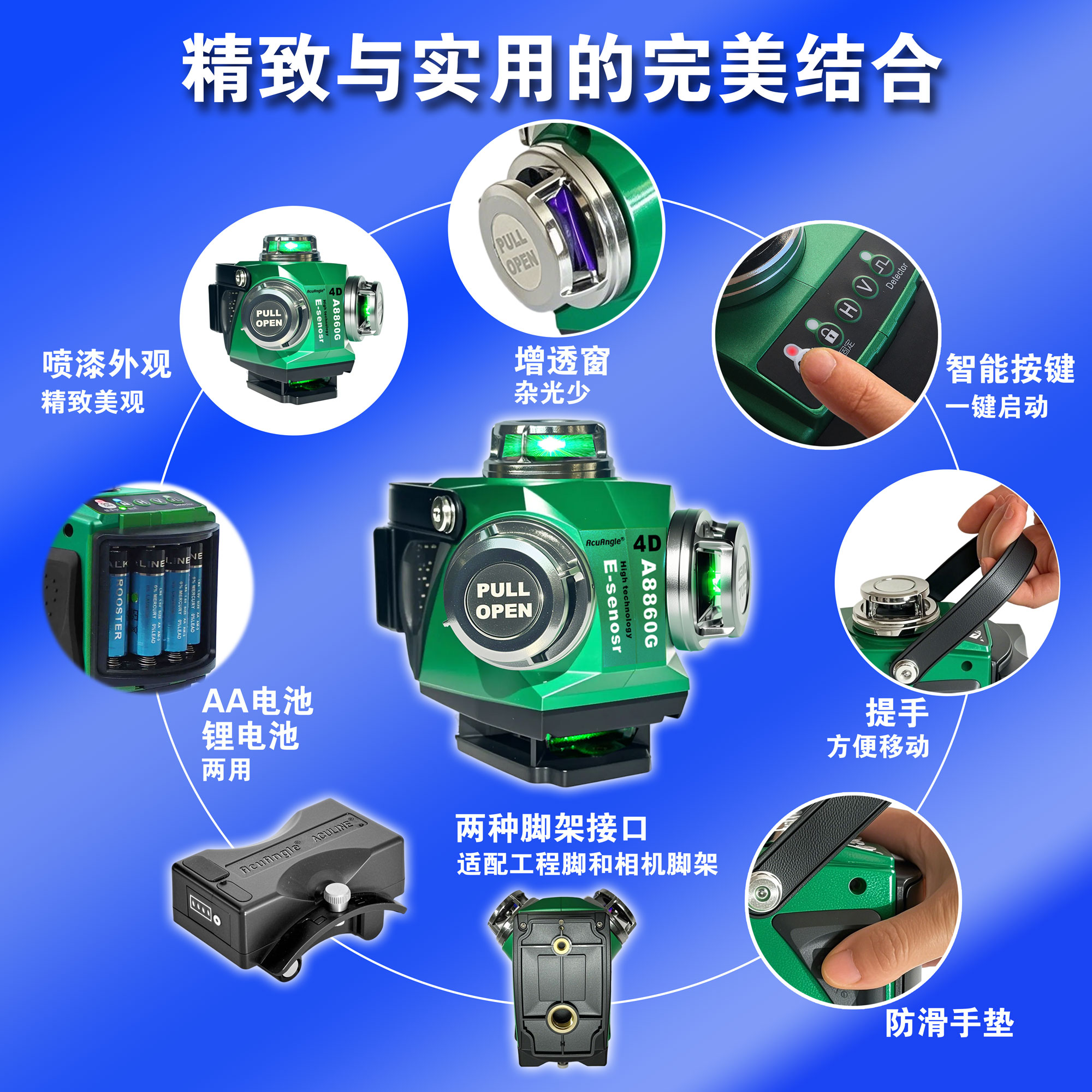 ->一键启动,水平线、垂直线有单独按键,操作简便且节约电量。